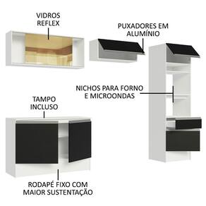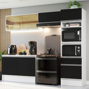 Por fim, o acabamento da estrutura é branco e as portas e frentes são pretas. É feito em Poliéster Protetor ecológico, que consiste na aplicação de 7 camadas resistentes a álcool, água e calor.