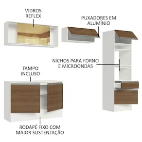 Construída com materiais de qualidade, conta com puxadores em perfil total de alumínio, dobradiças e corrediças metálicas, além de rodapé frontal fixo, proporcionando maior segurança e sustentação.