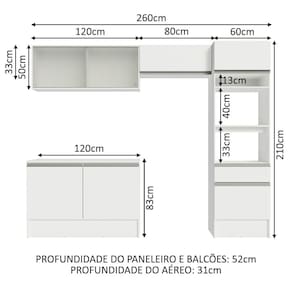 Fabricado com materiais de qualidade, conta com puxadores em perfil total de alumínio, dobradiças e corrediças metálicas, além do aéreo com portas de vidro que agrega beleza e sofisticação ao ambiente.