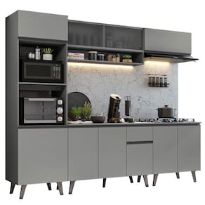 Itens inclusos: - Uma (1) Torre Quente de 60 cm com duas (2) portas e dois (2) nichos para fornos - Um (1) Aéreo de 120 cm com duas (2) portas de correr de vidro pontilhado e um (1) nicho - Um (1) Balcão de 120 cm com três (3) portas, uma (1) gaveta e tampo - Um (1) Aéreo de 80 cm com uma (1) porta basculante - Um (1) Balcão de 80 cm com duas (2) portas e tampo