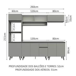Medidas totais: - 260 cm de largura - 211 cm de altura - 52 cm de profundidade nos balcões e na torre e 31 cm nos aéreos