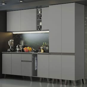 Por sua ótima distribuição, oferece muito espaço para a organização de todos os utensílios. Além disso, a cozinha é totalmente modulada e pode ser disposta seguindo a melhor escolha para o seu ambiente. É praticamente uma cozinha planejada, não é demais?