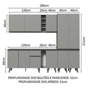 Medidas totais: - 260 cm de largura - 211 cm de altura - 52 cm de profundidade nos balcões e nos paneleiros e 31 cm nos aéreos
