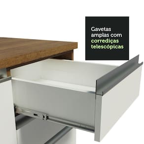 A fabricação é feita com materiais de qualidade, como corrediças telescópicas, puxadores com perfil total em alumínio, dobradiças com amortecimento e pés reguláveis em PVC, com rodapé removível em MDP.