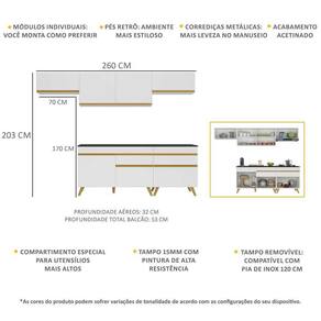 Dimensões do produto montado: Altura: 203cm | Largura: 260cm | Profundidade: 32cm (aéreos) - 53cm (balcão com tampo) *Você pode consultar as medidas internas na imagem técnica do produto.