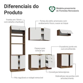 O acabamento de alta resistência da estrutura é em tom amadeirado Rustic e das frentes em Branco, possui uma textura suave ao toque, trazendo leveza e sofisticação ao ambiente. O destaque fica por conta dos puxadores ponto em ouro envelhecido, feitos com metal resistente, trazem personalidade e um charme único.