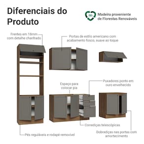 O acabamento de alta resistência da estrutura é em tom amadeirado Rustic e das frentes em Cinza, possui uma textura suave ao toque, trazendo leveza e sofisticação ao ambiente. O destaque fica por conta dos puxadores ponto em ouro envelhecido, feitos com metal resistente, trazem personalidade e um charme único.