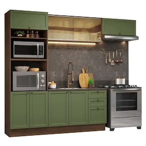 O acabamento de alta resistência da estrutura é em tom amadeirado Rustic, das frentes em Verde e possui uma textura suave ao toque. O destaque fica por conta dos puxadores ponto em ouro envelhecido, feitos com metal resistente, trazem personalidade e um charme único. Outro diferencial está no detalhe chanfrado das frentes, que forma molduras elegantes e dá profundidade ao design.
