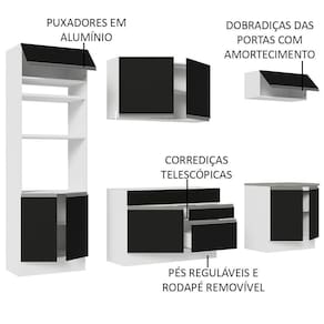 O acabamento da cozinha combina os tons preto e branco. É feito em Pintura Poliéster com 7 camadas que protegem o móvel dos efeitos do álcool da água e do calor.