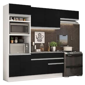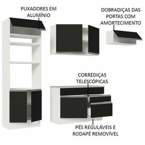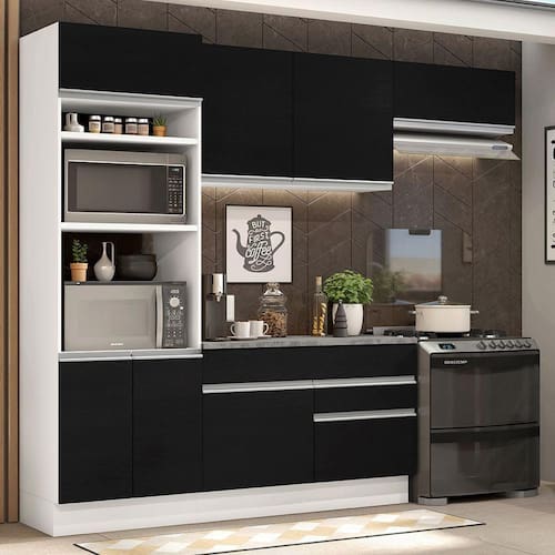 O acabamento da cozinha combina os tons branco e preto. É feito em Pintura Poliéster com 7 camadas que protegem o móvel dos efeitos do álcool da água e do calor.