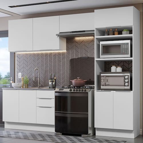 Este modelo oferece espaço para armazenar de tudo: forno, micro-ondas, garrafas, louças, eletros, panos e qualquer outra coisa que você possa imaginar. É a escolha ideal para deixar sua cozinha extremamente organizada e funcional.