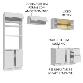 Para completar, o balcão tem capacidade para pias de 120 cm x 52 cm, e todos os módulos inferiores possuem pés reguláveis em PVC, além de rodapé removível em MDP com encaixe rápido.