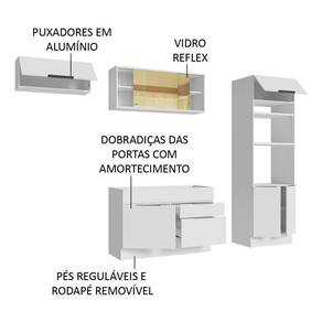 O móvel conta com puxadores em alumínio no modelo slim, gavetas com corrediças telescópicas e portas com amortecimento para fechamento suave. Além disso, os pés são reguláveis em PVC, com rodapé removível de MDP.