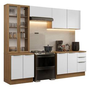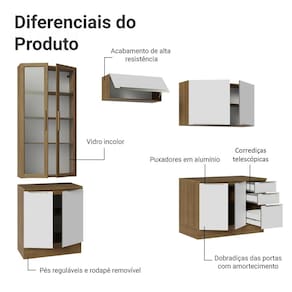 Fabricada com alto padrão de qualidade, a cozinha conta com vidro incolor sobreposto nas frentes e portas, puxadores em alumínio, gavetas com corrediças telescópicas de abertura total, portas com amortecimento para fechamento suave.