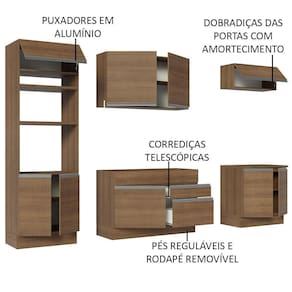 Os vários aéreos e balcões possuem ótimo espaço interno e externo. A torre quente conta com nichos especiais para forno e micro-ondas. Além disso, o balcão maior comporta pias de inox ou pedra e o balcão de 80 cm pode ser recortado para a instalação de cooktop.