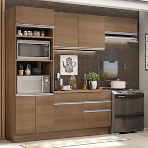 Os aéreos e balcões proporcionam ótimo espaço interno e externo e a torre quente conta com nichos especiais para forno e micro-ondas. Além disso, o balcão acompanha tampo, que pode ser recortado caso você deseje instalar uma pia de inox ou pedra.