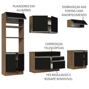 Os vários aéreos e balcões possuem ótimo espaço interno e externo. A torre quente conta com nichos especiais para forno e micro-ondas. Além disso, o balcão maior comporta pias de inox ou pedra e o balcão de 80 cm pode ser recortado para a instalação de cooktop.