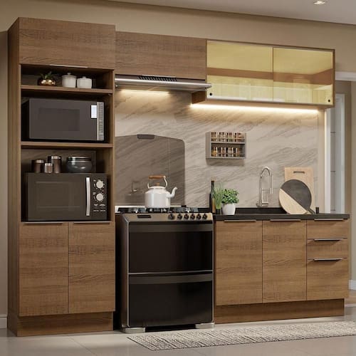 Esta cozinha foi projetada pensando em oferecer espaço amplo para armazenar tudo o que você precisa. Você encontrará lugar para o forno, micro-ondas, louças e demais utensílios. É a escolha perfeita para quem valoriza organização e funcionalidade.