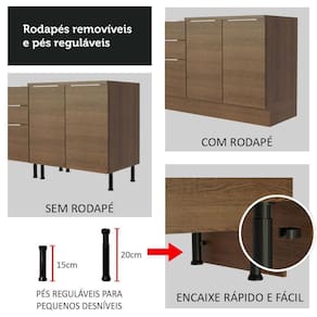 Para completar, o balcão tem capacidade para pias de 120 cm x 52 cm, e todos os módulos inferiores possuem pés reguláveis em PVC, além de rodapé removível em MDP com encaixe rápido.