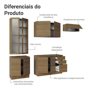 Outros diferenciais deste móvel são os puxadores em alumínio e as gavetas com corrediças telescópicas de abertura total. Possui ainda portas com amortecimento para fechamento suave e pés reguláveis em PVC.