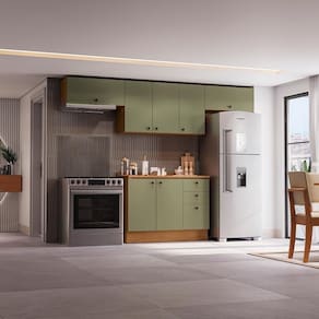 Já as frentes, na cor verde frevo, contam com acabamento fosco em BP, proporcionando maior durablidade contra riscos, arranhões e gotas d'água. Uma combinação aconchegante e moderna, remetendo aos tons da natureza e deixando seu ambiente lindo, incluindo facilidade durante a limpeza. Compacto e funcional, são 2,20m de altura, 2,80m de largura e 52cm de profundidade, perfeito para o estilo minimalista, o combo une o balcão de pia e três aéreos, sendo dois basculantes e um aéreo de pia, uma composição versátil e indispensável para quem procura por funcionalidade.