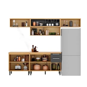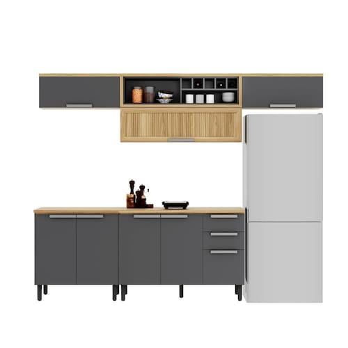 Com 280cm de largura, a composição é versátil e bem distribuída. Inclui: Um armário aéreo de 120cm com uma porta horizontal e nicho aberto, oferecendo fácil acesso a itens do dia a dia. Dois armário aéreos de 80cm com uma porta horizontal, com abertura com pistão à gás. Um balcão de 120cm com três portas e duas gavetas e um tampo em BP resistente a altas temperaturas (até 120 C). Um balcão de 80cm com duas portas para completar seu espaço.