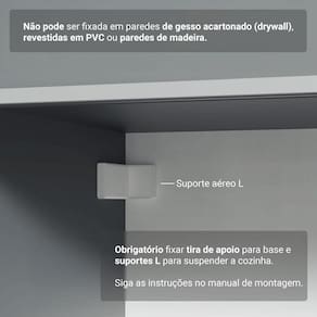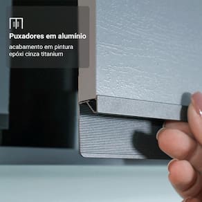 O acabamento de alta resistência no tom Cinza e os puxadores em alumínio reforçam o visual moderno. Possui corrediças que proporcionam abertura total das gavetas, e a porta basculante permanece suspensa durante o uso. Os balcões acompanham tampo, garantindo mais praticidade.