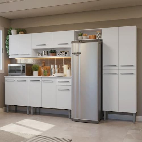 Com módulos avulsos que podem ser organizados de acordo com a necessidade do seu ambiente, ela oferece espaço amplo para guardar utensílios, louças, eletrodomésticos e acomodar a geladeira, tornando o dia a dia mais prático.