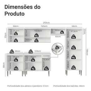 - 44 cm de profundidade nos balcões e 27cm nos aéreos/paneleiro