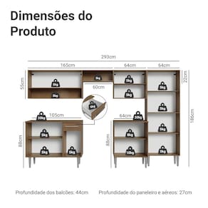 - 44 cm de profundidade nos balcões e 27 cm de profundidade nos aéreos e no paneleiro