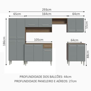 - 44 cm profundidade nos balcões e 27 cm nos aéreos e no paneleiro