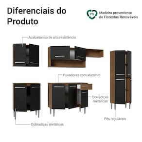 A linha Emilly se destaca pelo acabamento de alta resistência, puxadores em alumínio, corrediças e dobradiças metálicas, garantindo durabilidade no uso diário. Os pés reguláveis proporcionam estabilidade e facilitam a limpeza. O acabamento em tom amadeirado Rustic e Preto dá um toque elegante e moderno à sua cozinha.