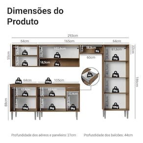 - 44 cm de profundidade nos balcões e 27cm nos aéreos/paneleiro