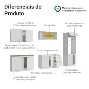 O balcão de 120 cm tem o espaço adequado para a instalação de pia. Além disso, o aéreo possui porta bascultante com sistema de pistão a gás que mantém a porta suspensa quando aberta, proporcionando mais praticidade e segurança no uso diário.