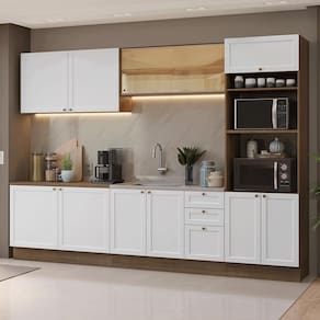 O balcão de 120 cm tem o espaço adequado para a instalação de pia. Além disso, o aéreo possui porta bascultante com sistema de pistão a gás que mantém a porta suspensa quando aberta, proporcionando mais praticidade e segurança no uso diário.