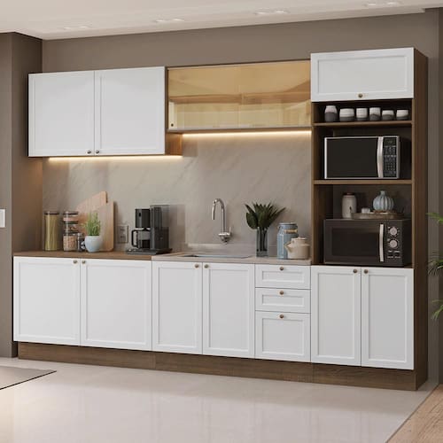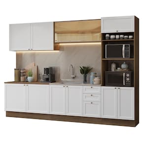 A Cozinha Completa da Linha Vik da Madesa possui 310 cm de largura e une funcionalidade e um design clássico com elementos modernos. Um dos grandes destaques dessa cozinha é o armário aéreo com vidro reflex, que adiciona um toque de sofisticação e modernidade ao ambiente.