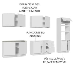 Possui fabricação com materiais de qualidade superior. Conta com puxadores slim em alumínio, gavetas com corrediças telescópicas e portas com amortecimento para fechamento suave. Além disso, os pés são reguláveis em PVC, com rodapé removível de MDP.