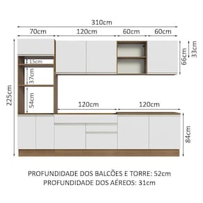 O espaço interno e externo nos aéreos e balcões é ótimo para a organização de todos os utensílios, louças e decorações. A torre comporta forno e micro-ondas e o balcão de pia possibilita a colocação de pias de inox ou pedra. Ou seja, tem lugar pra tudo que você precisa!