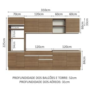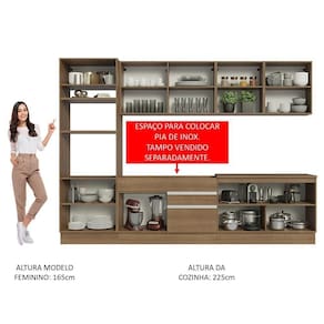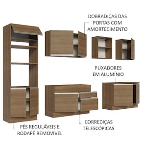 O espaço interno e externo nos aéreos e balcões é ótimo para a organização de todos os utensílios, louças e decorações. A torre comporta forno e micro-ondas e o balcão de pia possibilita a colocação de pias de inox ou pedra. Ou seja, tem lugar pra tudo que você precisa!