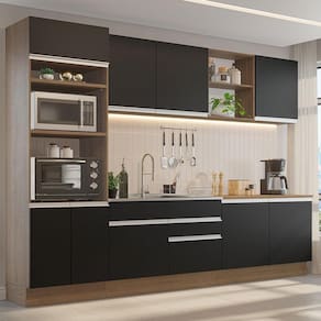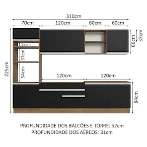 O espaço interno e externo nos aéreos e balcões é ótimo para a organização de todos os utensílios, louças e decorações. A torre comporta forno e micro-ondas e o balcão de pia possibilita a colocação de pias de inox ou pedra. Ou seja, tem lugar pra tudo que você precisa!