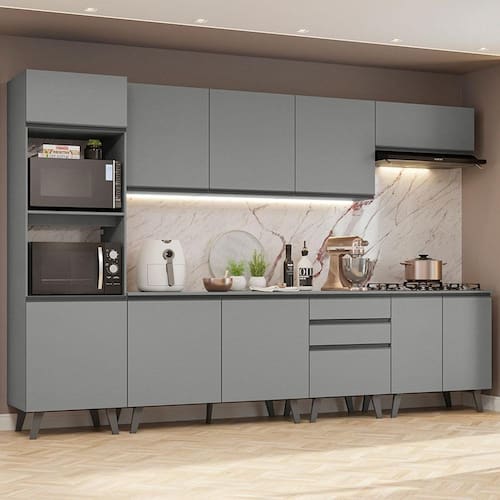 O acabamento da cozinha é cinza, feito em Pintura Poliéster ecológica, que oferece proteção contra os efeitos da água e do calor.
