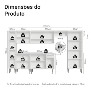 - 44 cm de profundidade nos balcões e 27 cm de profundidade nos aéreos e no paneleiro