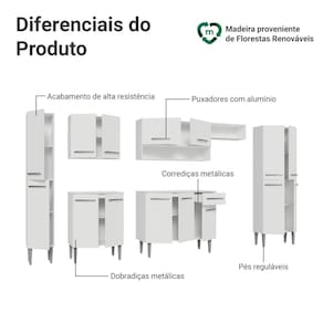 A linha Emilly se destaca pelo acabamento de alta resistência, puxadores em alumínio, corrediças e dobradiças metálicas, garantindo durabilidade no uso diário. Os pés reguláveis proporcionam estabilidade e facilitam a limpeza. O acabamento em Branco transforma o espaço, trazendo leveza para o seu dia a dia