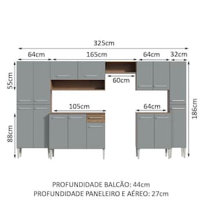 - 44 cm de profundidade nos balcões e 27 cm de profundidade nos aéreos e nos paneleiros