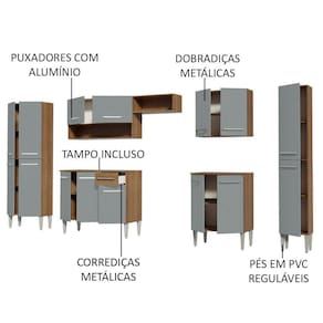 Possui materiais de qualidade superior, como puxadores com alumínio, corrediças e dobradiças metálicas e pés em PVC com regulagem para pequenas imperfeições no piso.
