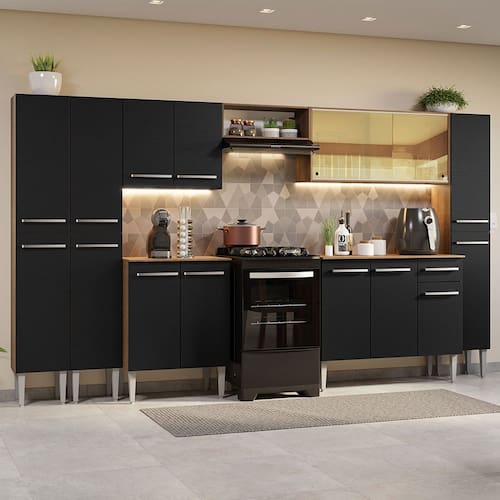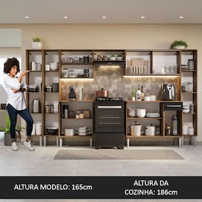 Fabricada com materiais de qualidade superior, a cozinha possui puxadores com alumínio, corrediças e dobradiças metálicas e pés em PVC com regulagem para pequenos desníveis no piso.