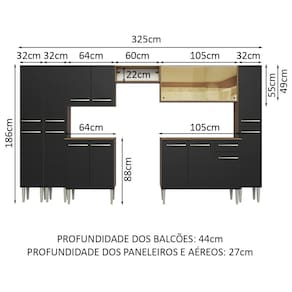 - 44 cm de profundidade nos balcões e 27 cm de profundidade nos aéreos e nos paneleiros