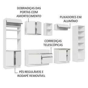 O acabamento da cozinha é branco, feito em Pintura Poliéster com 7 camadas que protegem o móvel dos efeitos da água e do calor.