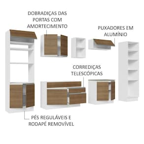 O acabamento da estrutura é branco e o das portas e frentes é em amadeirado Rustic. É feito em Pintura Poliéster com 7 camadas que protegem o móvel dos efeitos da água e do calor.