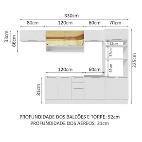 - 52 cm de profundidade no balcão e nas torres e 31 cm nos aéreos